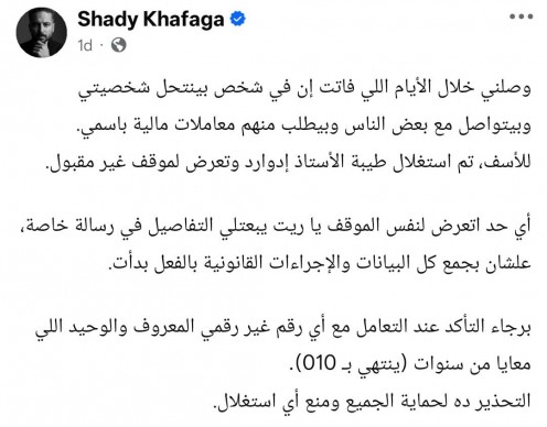 وكتب:وصلني خلال الأيام اللي فاتت إن في شخص بينتحل شخصيتي وبيتواصل مع بعض الناس وبيطلب منهم معاملات مالية باسمي.